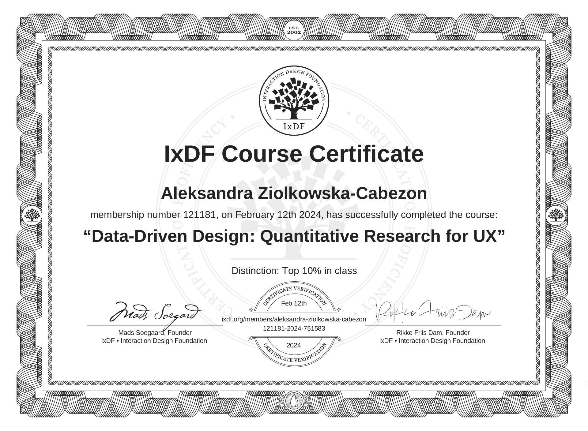 Aleksandra Ziółkowska-Cabezón's IxDF Course Certificate: Data-Driven Design: Quantitative Research for UX