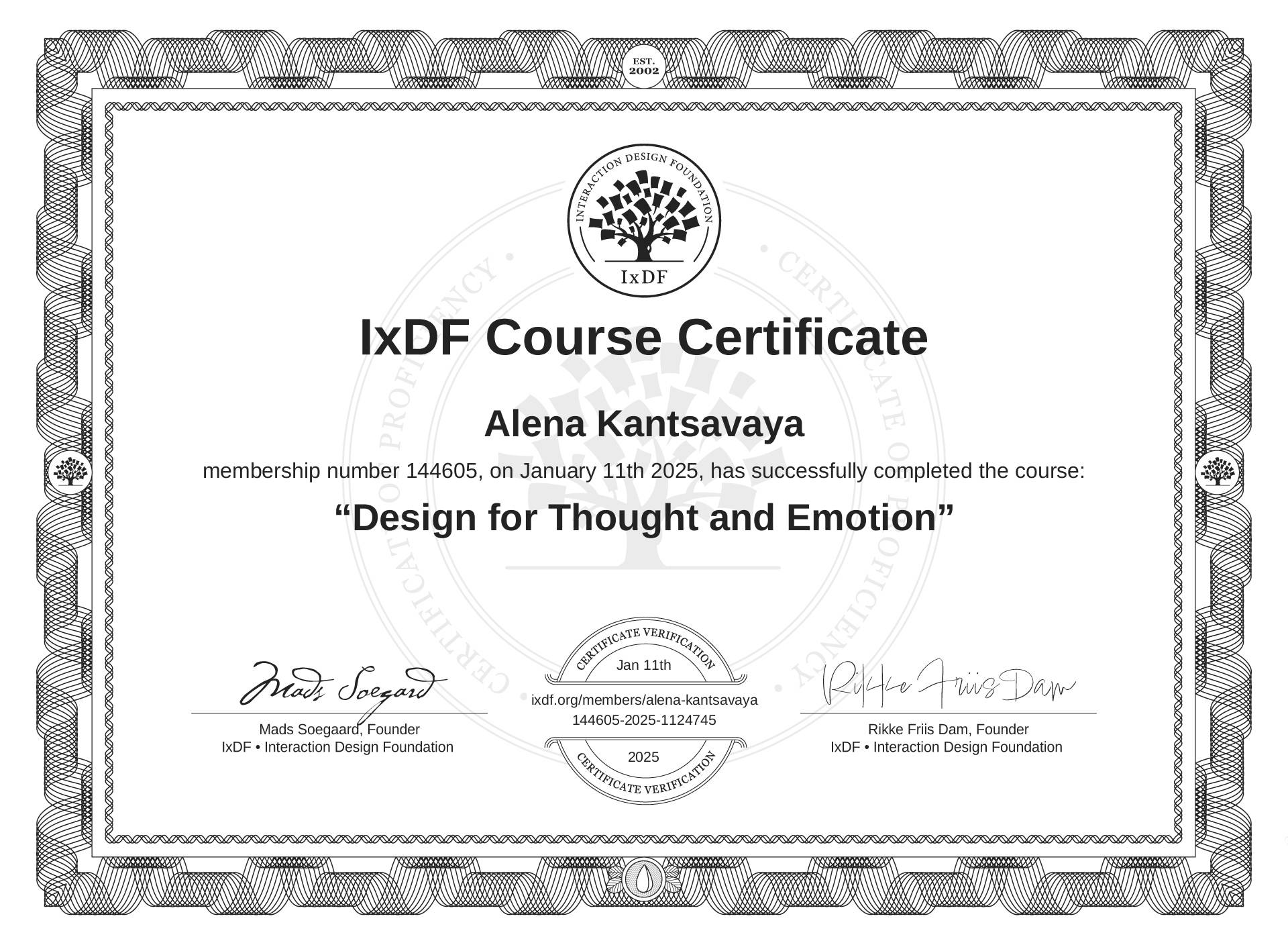 Alena Kantsavaya's IxDF Course Certificate: Design for Thought and Emotion