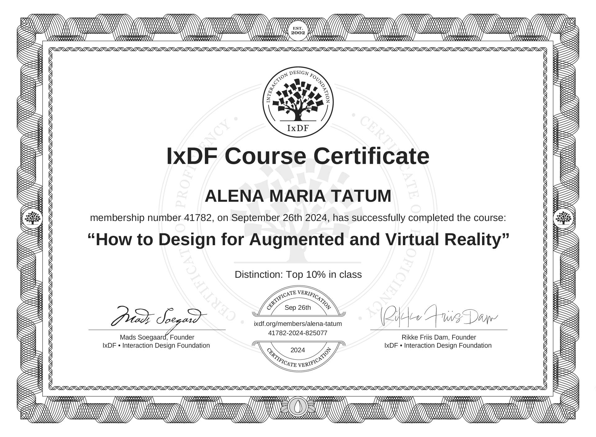 The IxDF Course Certificate above is awarded to ALENA MARIA TATUM with a Top 10% Distinction in formal recognition of their coursework surpassing the rigorous benchmarks of exceptional performance established by the IxDF Educational Codex.