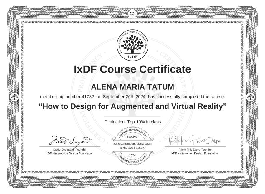 ALENA MARIA TATUM's IxDF Course Certificate: How to Design for Augmented and Virtual Reality