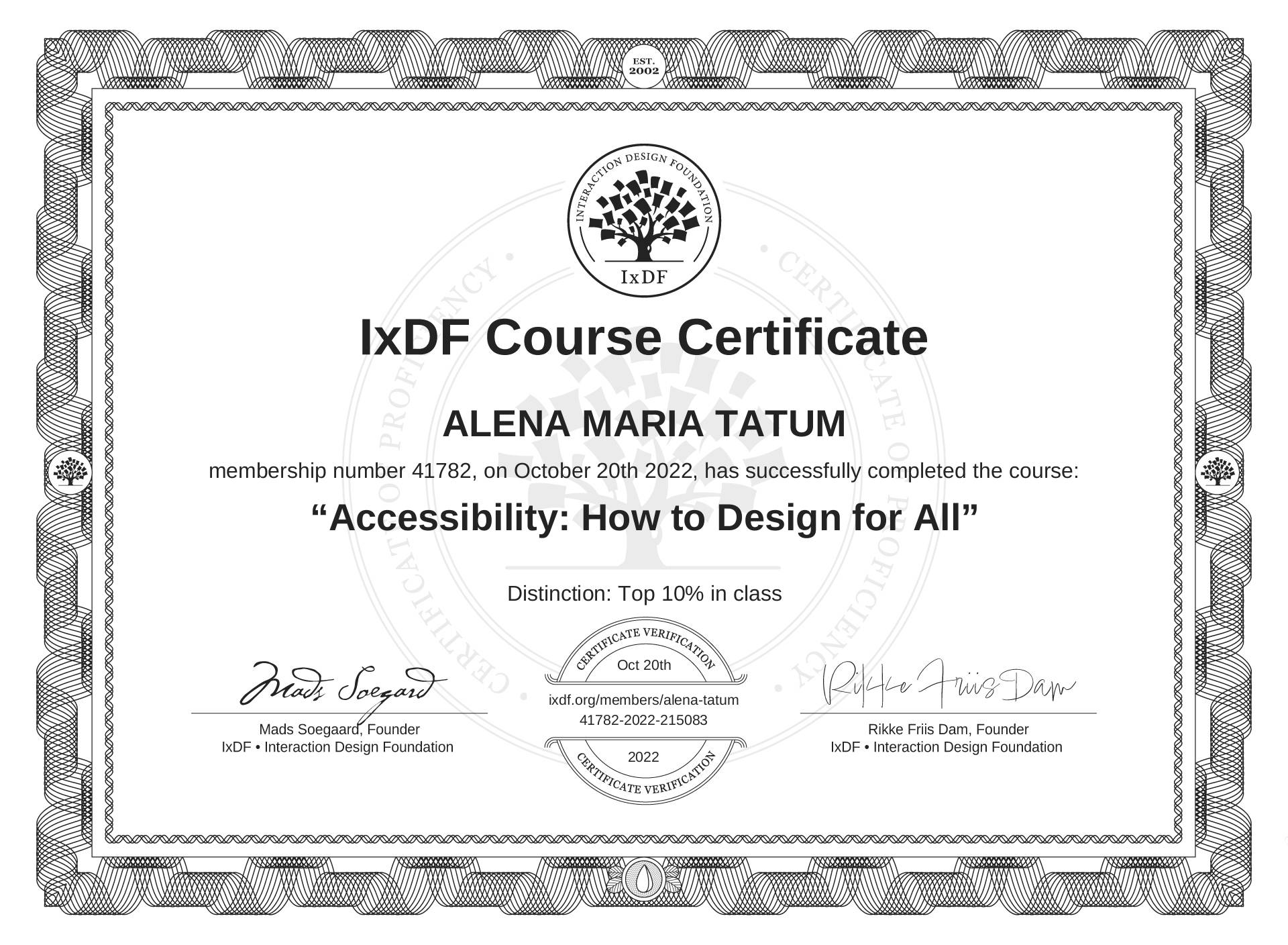 The IxDF Course Certificate above is awarded to ALENA MARIA TATUM with a Top 10% Distinction in formal recognition of their coursework surpassing the rigorous benchmarks of exceptional performance established by the IxDF Educational Codex.