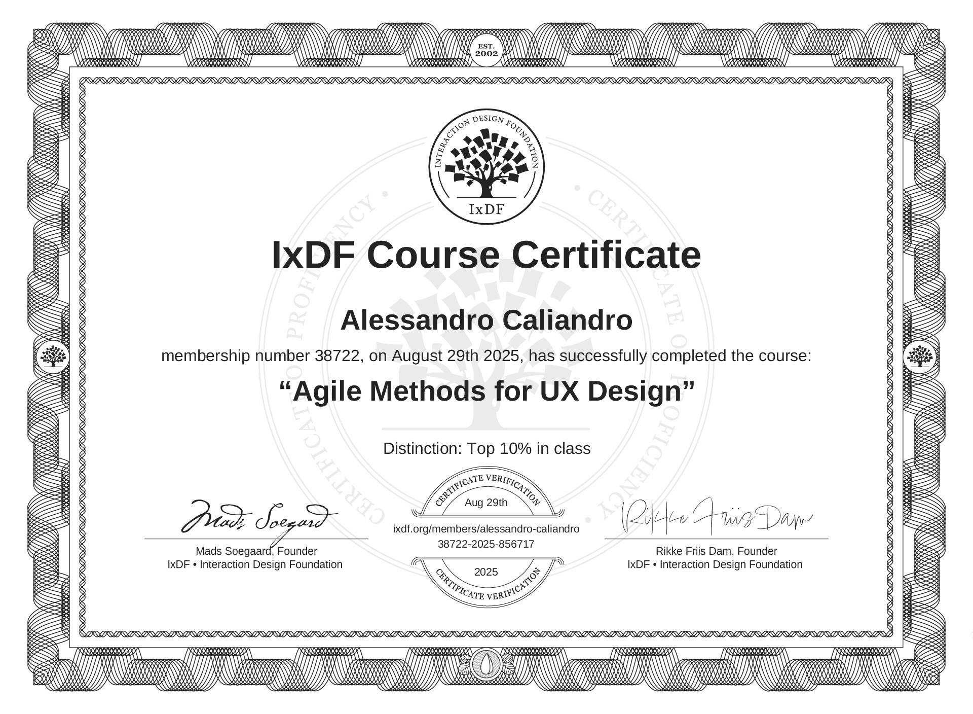 The IxDF Course Certificate above is awarded to Alessandro Caliandro with a Top 10% Distinction in formal recognition of their coursework surpassing the rigorous benchmarks of exceptional performance established by the IxDF Educational Codex.