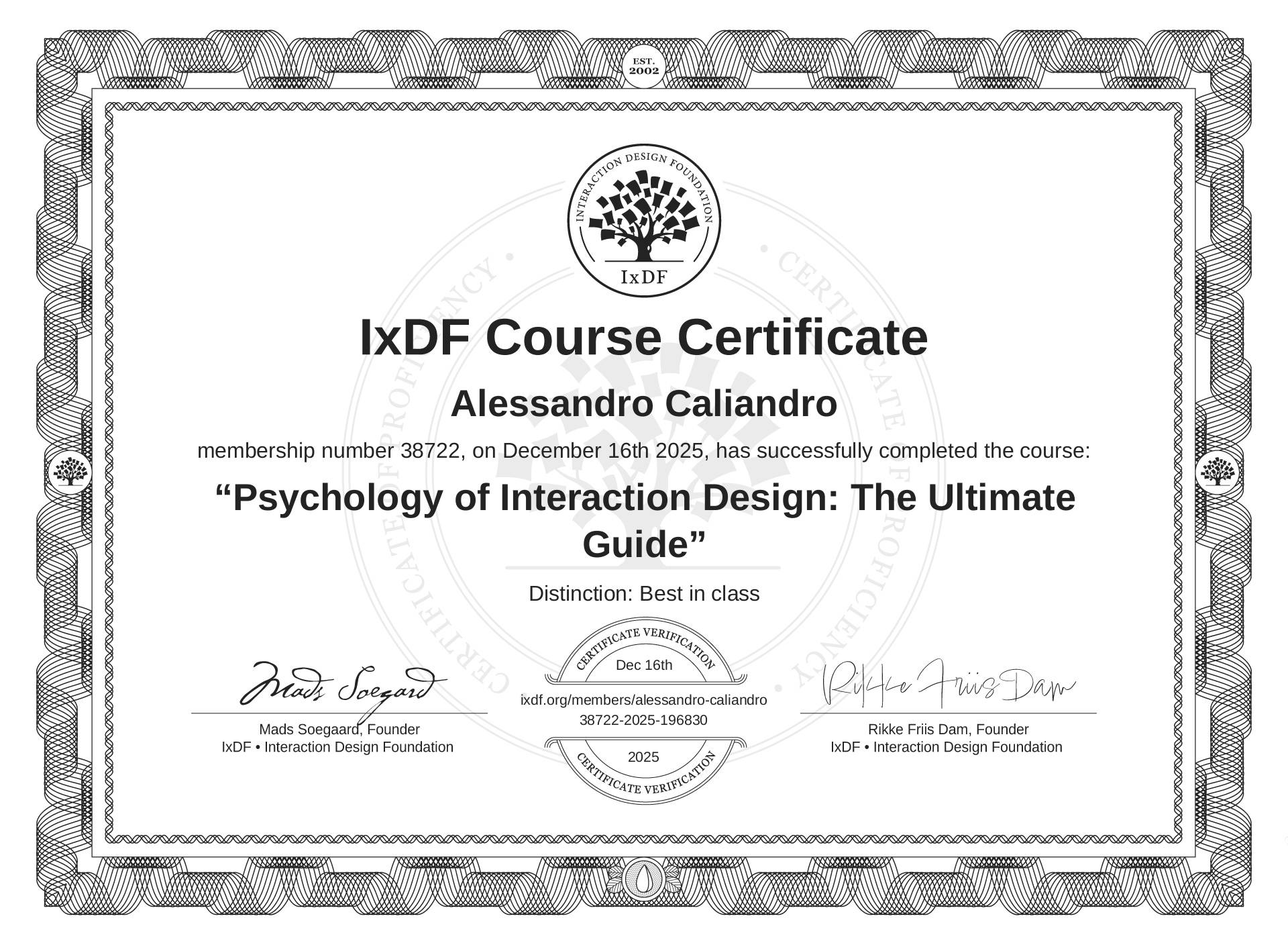 The IxDF Course Certificate above is awarded to Alessandro Caliandro with a Best in Class Distinction in formal recognition of their coursework surpassing the rigorous benchmarks of exceptional performance established by the IxDF Educational Codex.
