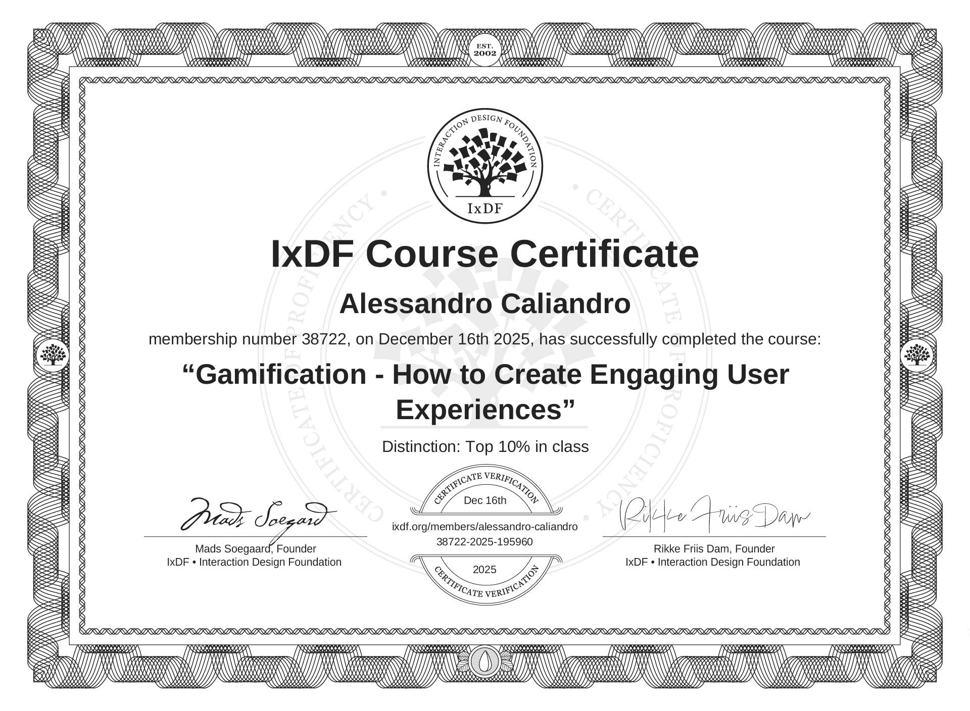 Alessandro Caliandro's IxDF Course Certificate: Gamification - How to Create Engaging User Experiences