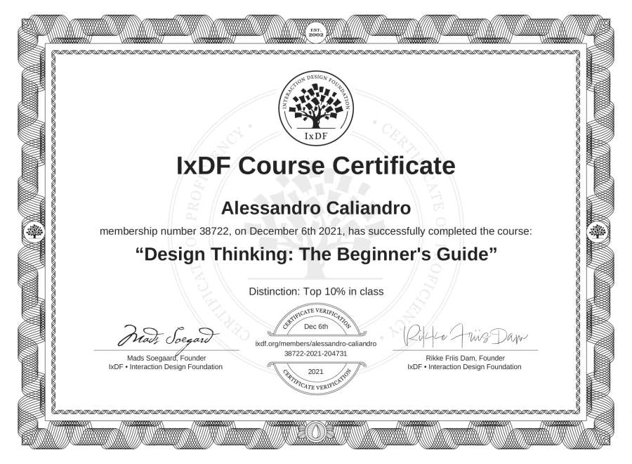 The IxDF Course Certificate above is awarded to Alessandro Caliandro with a Top 10% Distinction in formal recognition of their coursework surpassing the rigorous benchmarks of exceptional performance established by the IxDF Educational Codex.