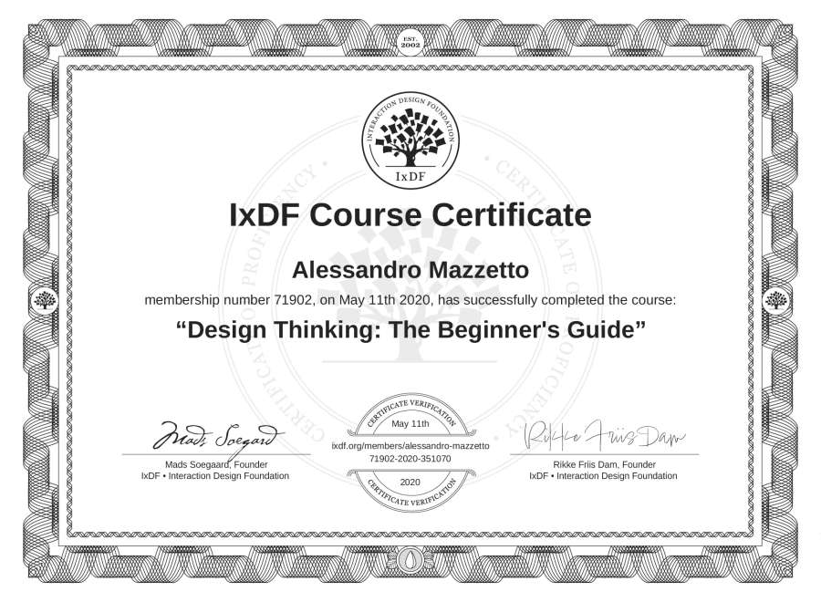 The IxDF Course Certificate above is awarded to Alessandro Mazzetto in formal recognition of their coursework surpassing the rigorous benchmarks of exceptional performance established by the IxDF Educational Codex.