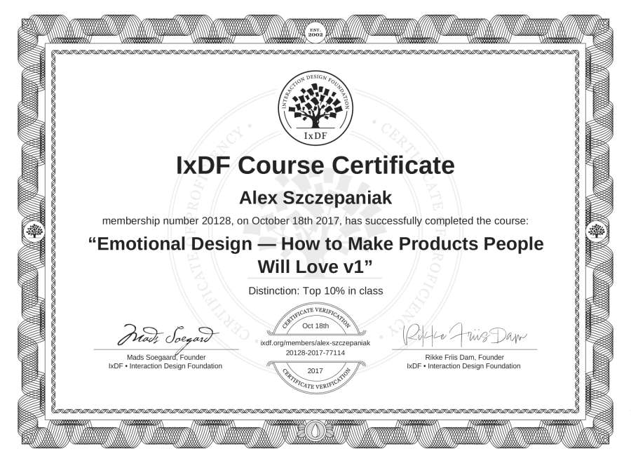 Alex Szczepaniak's IxDF Course Certificate: Emotional Design — How to Make Products People Will Love v1