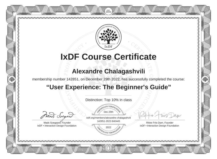 The IxDF Course Certificate above is awarded to Alexandre Chalagashvili with a Top 10% Distinction in formal recognition of their coursework surpassing the rigorous benchmarks of exceptional performance established by the IxDF Educational Codex.