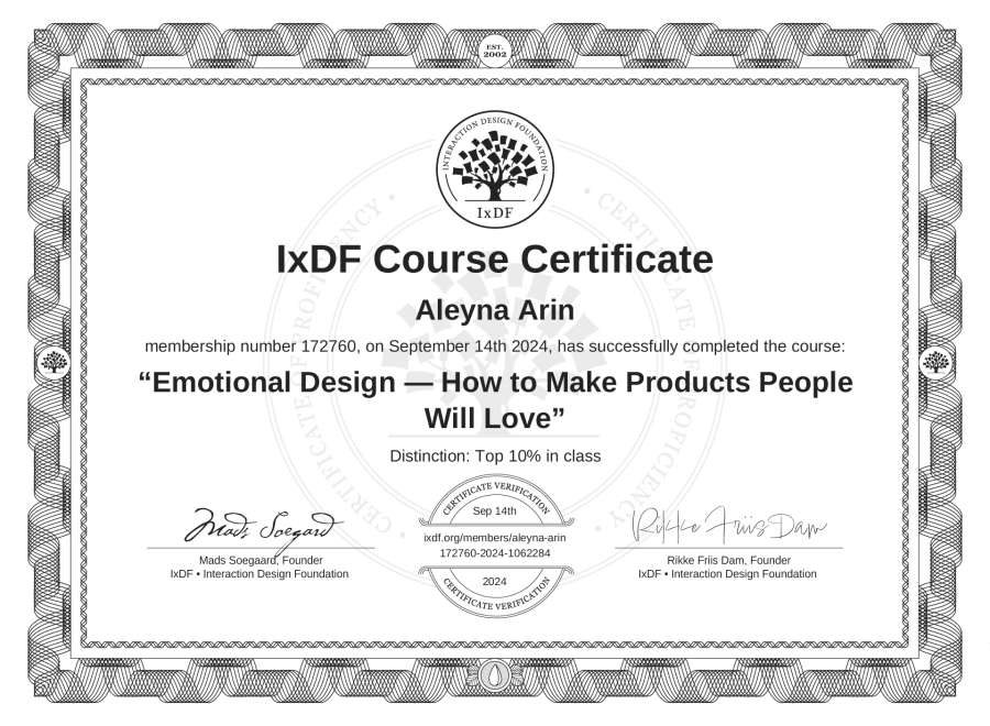 Aleyna Arın's IxDF Course Certificate: Emotional Design — How to Make Products People Will Love