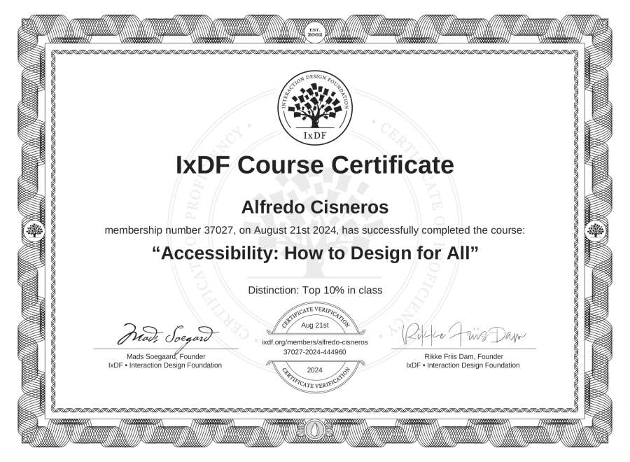 Alfredo Cisneros's IxDF Course Certificate: Accessibility: How to Design for All