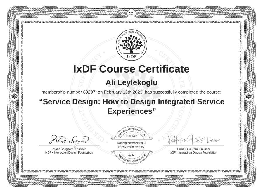 Ali Leylekoğlu's IxDF Course Certificate: Service Design: How to Design Integrated Service Experiences