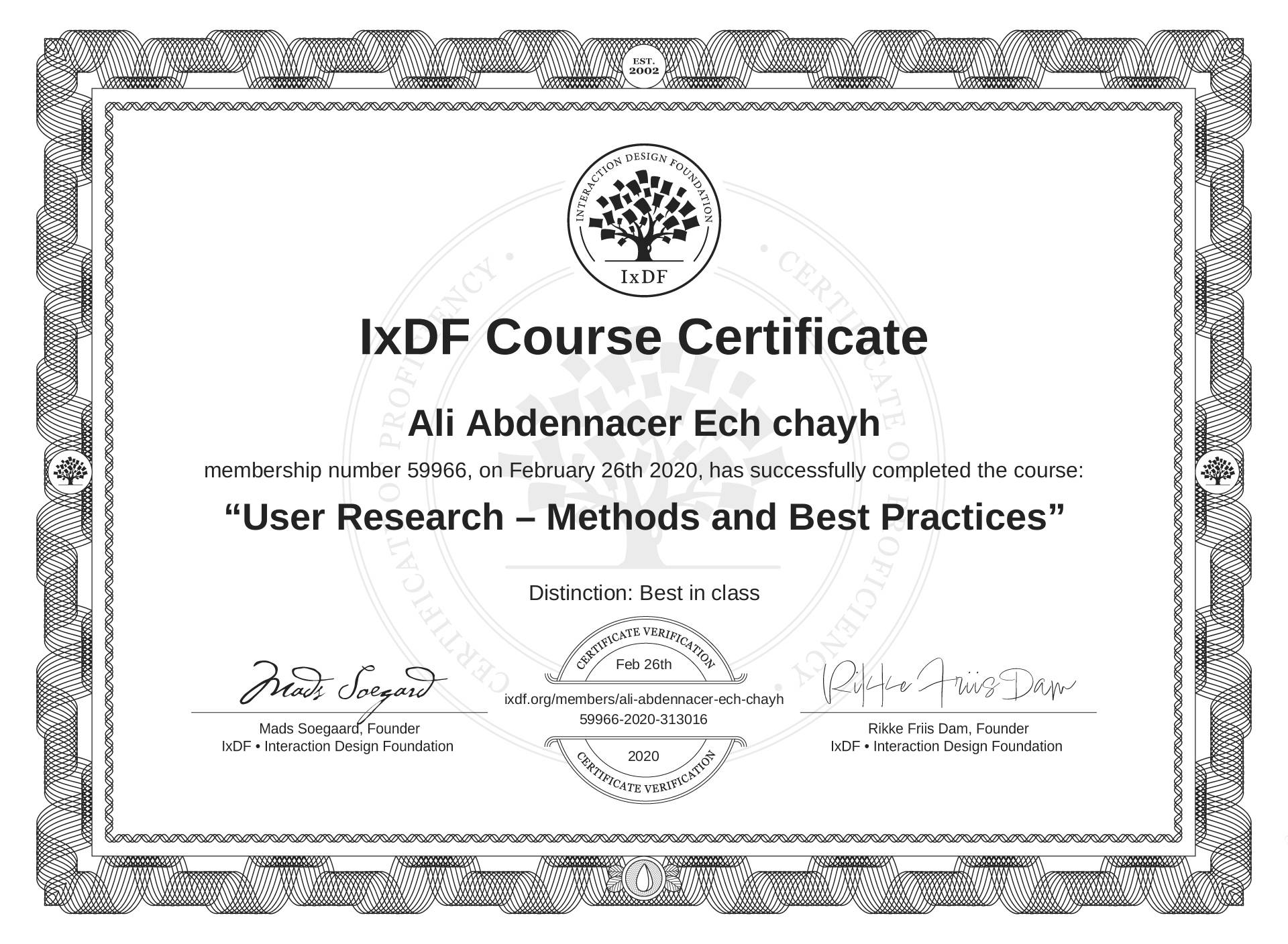 The IxDF Course Certificate above is awarded to Ali Abdennacer Ech chayh with a Best in Class Distinction in formal recognition of their coursework surpassing the rigorous benchmarks of exceptional performance established by the IxDF Educational Codex.
