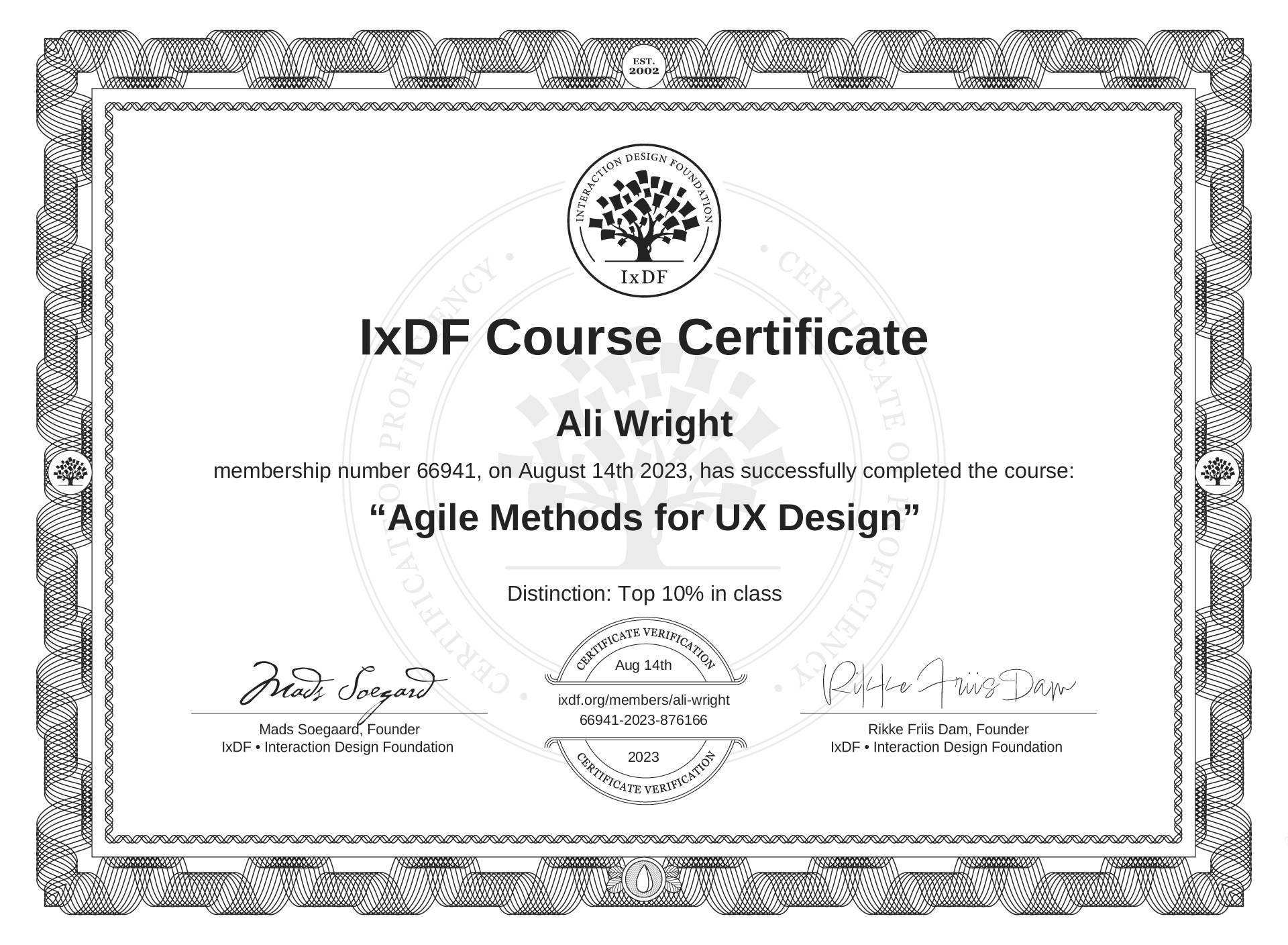 The IxDF Course Certificate above is awarded to Ali Wright with a Top 10% Distinction in formal recognition of their coursework surpassing the rigorous benchmarks of exceptional performance established by the IxDF Educational Codex.