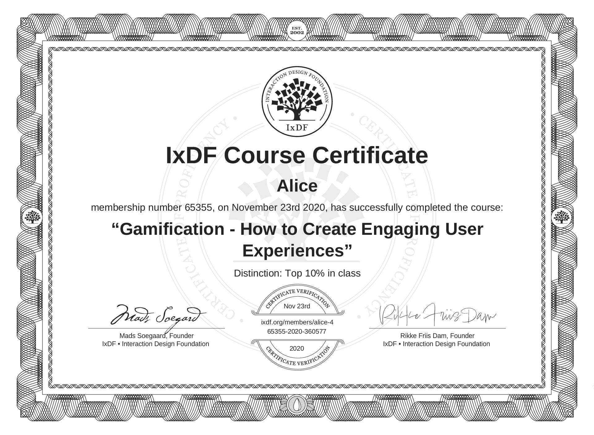 Alice's IxDF Course Certificate: Gamification - How to Create Engaging User Experiences
