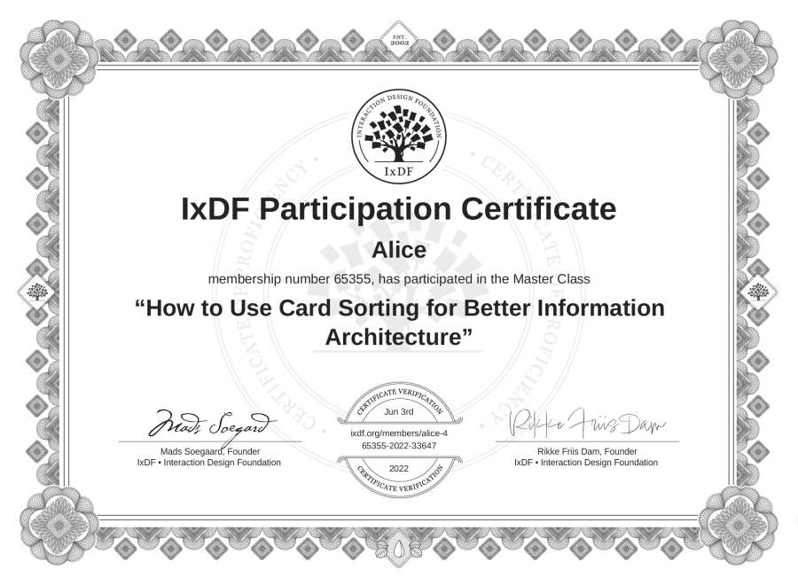 Alice's IxDF Masterclass Certificate: How to Use Card Sorting for Better Information Architecture