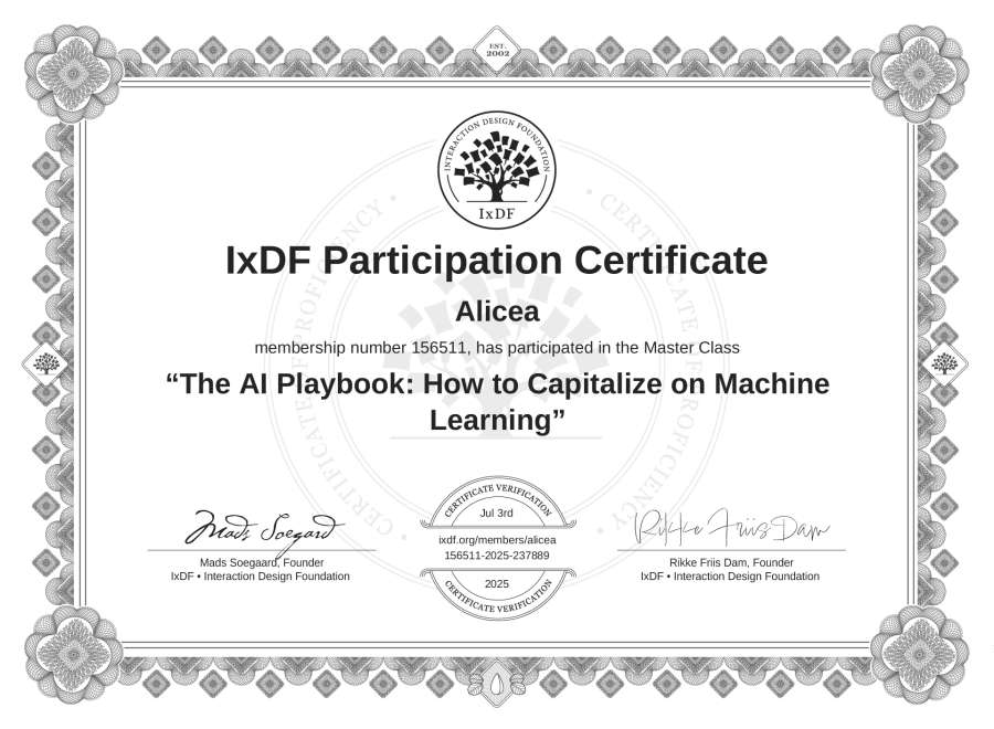 Alicea's IxDF Masterclass Certificate: The AI Playbook: How to Capitalize on Machine Learning
