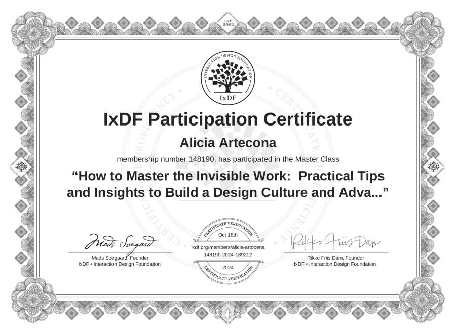 Alicia Artecona's IxDF Masterclass Certificate: How to Master the Invisible Work: Practical Tips and Insights to Build a Design Culture and Advance Your Career