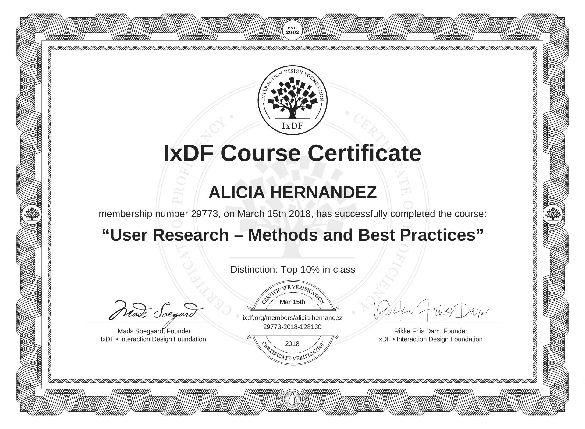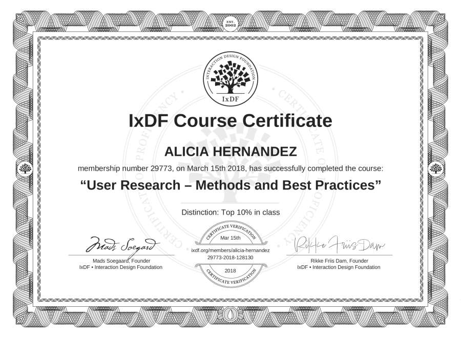 The IxDF Course Certificate above is awarded to ALICIA HERNANDEZ with a Top 10% Distinction in formal recognition of their coursework surpassing the rigorous benchmarks of exceptional performance established by the IxDF Educational Codex.