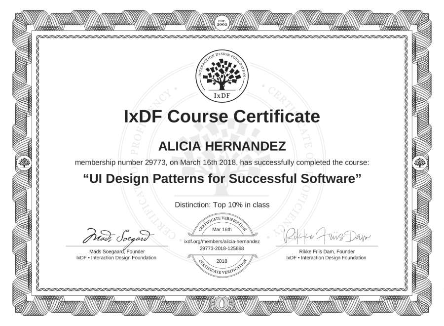 ALICIA HERNANDEZ's IxDF Course Certificate: UI Design Patterns for Successful Software