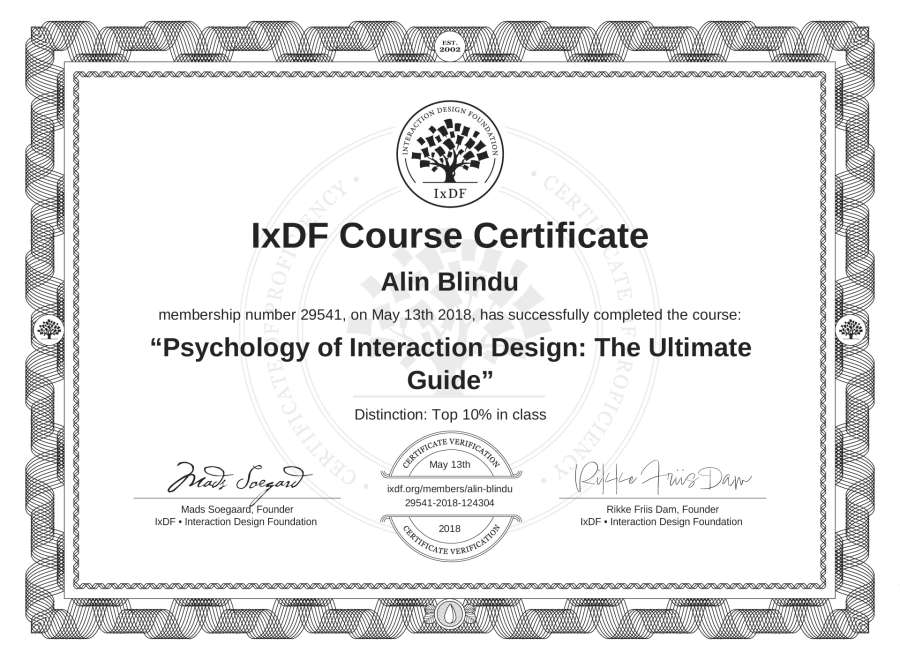 Alin Blindu's IxDF Course Certificate: Psychology of Interaction Design: The Ultimate Guide
