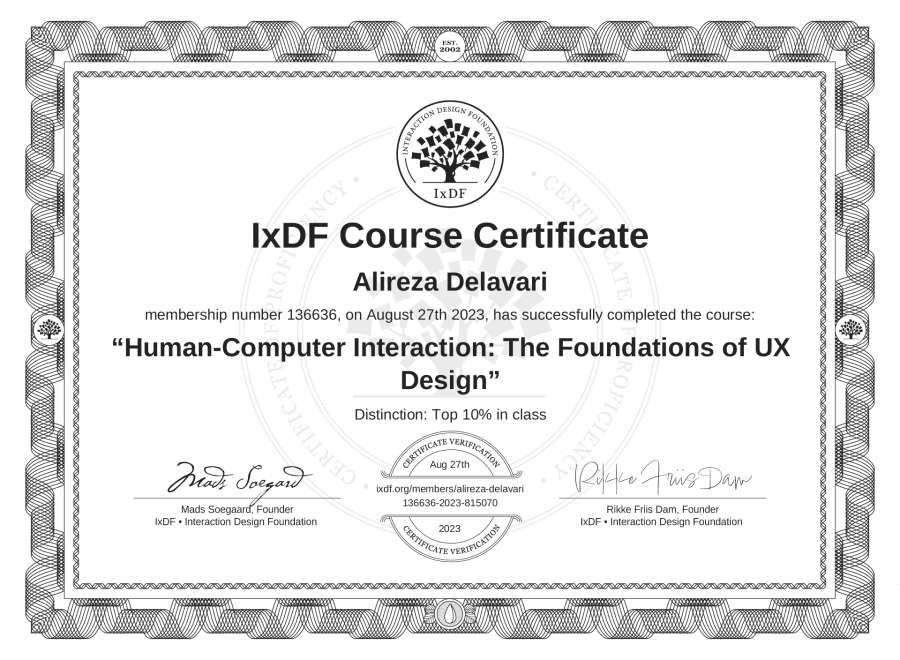 Alireza Delavari's IxDF Course Certificate: Human-Computer Interaction: The Foundations of UX Design
