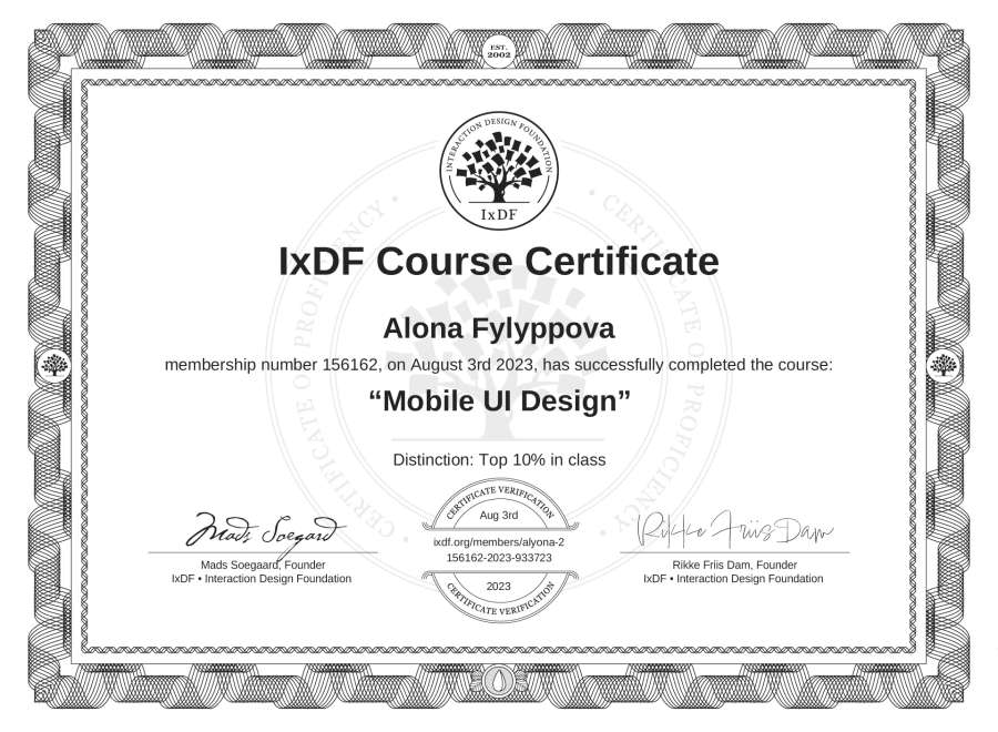 Alona Fylyppova's IxDF Course Certificate: Mobile UI Design