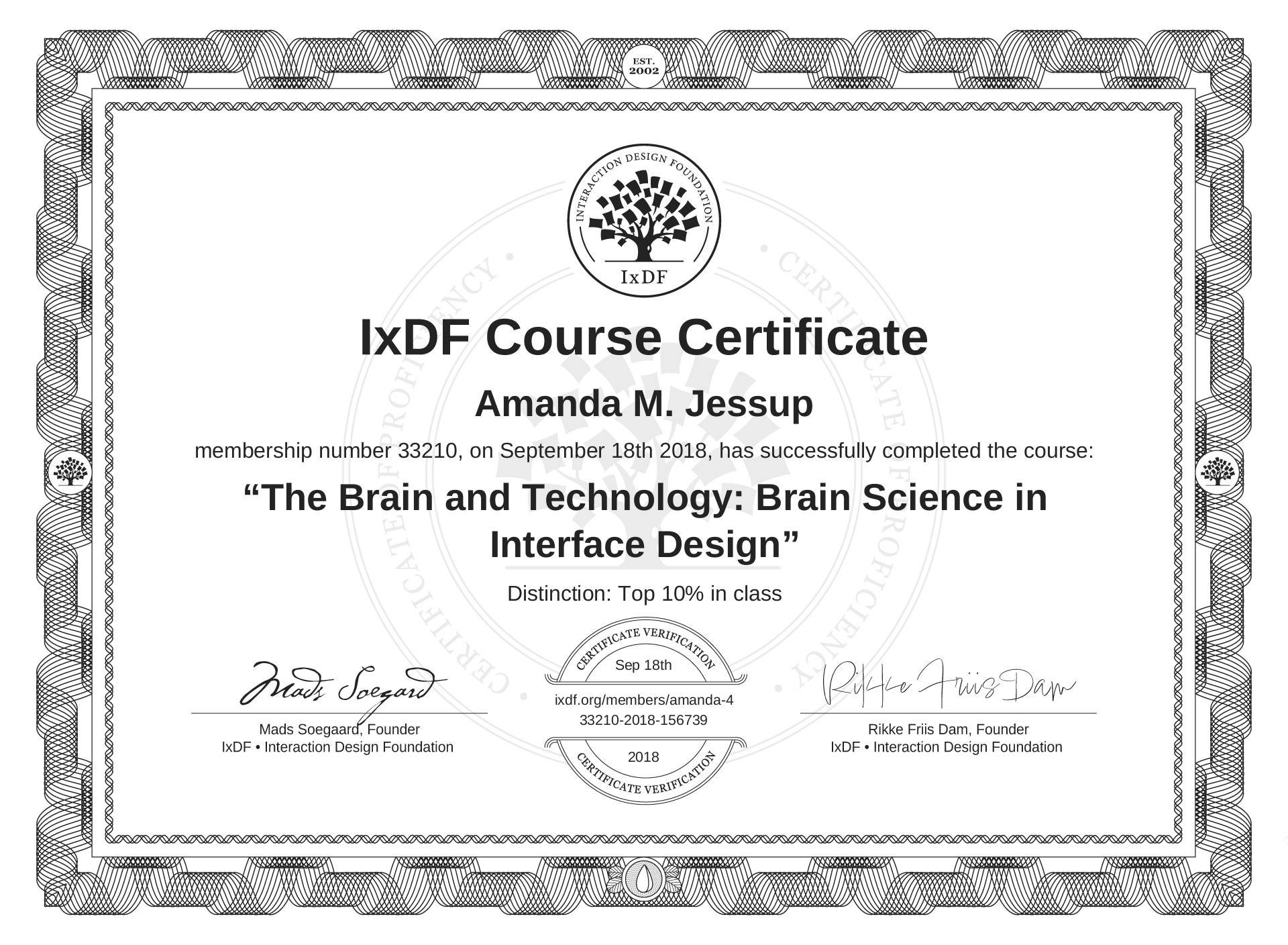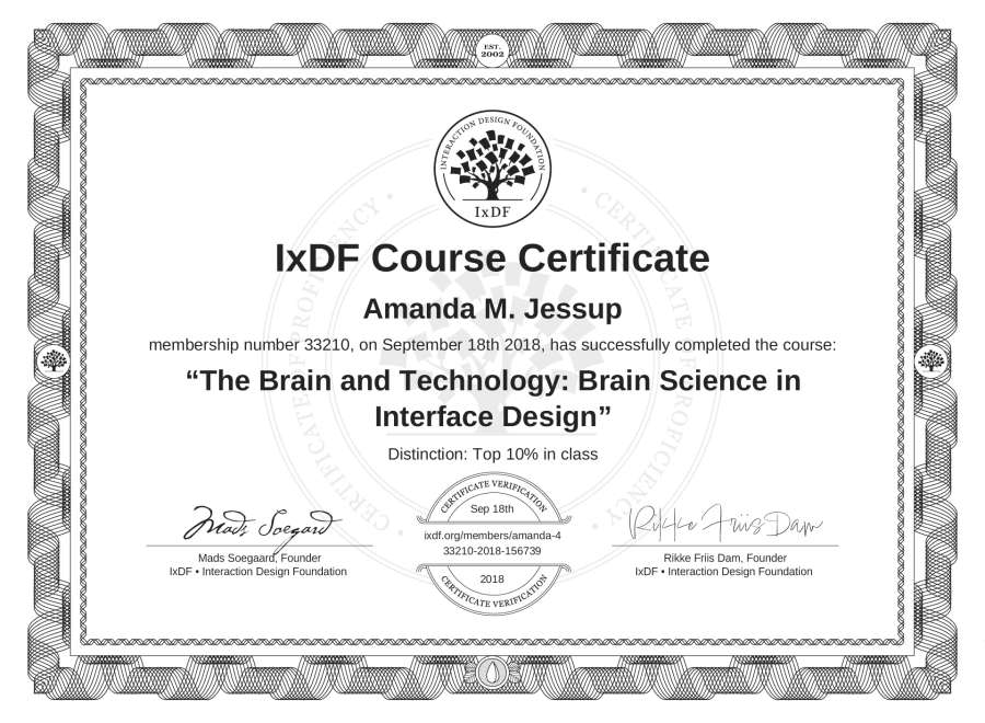 Amanda M. Jessup's IxDF Course Certificate: The Brain and Technology: Brain Science in Interface Design