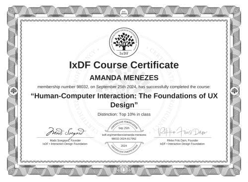 IxDF Course Certificates are awarded to AMANDA MENEZES in formal recognition of their coursework surpassing the rigorous benchmarks of exceptional performance established by the IxDF Educational Codex.