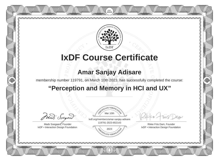 Amar Sanjay Adisare's IxDF Course Certificate: Perception and Memory in HCI and UX