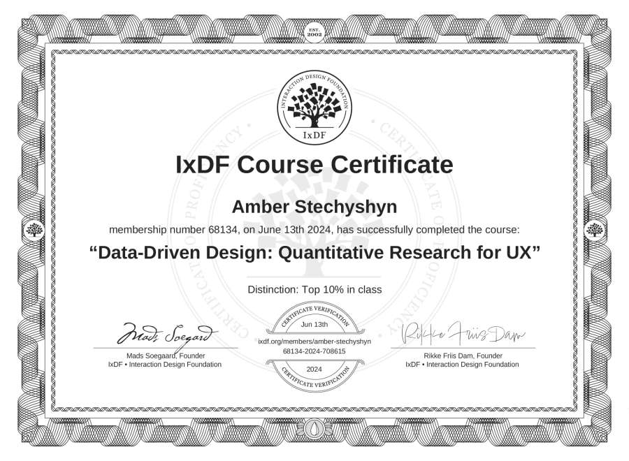 Amber Stechyshyn's IxDF Course Certificate: Data-Driven Design: Quantitative Research for UX