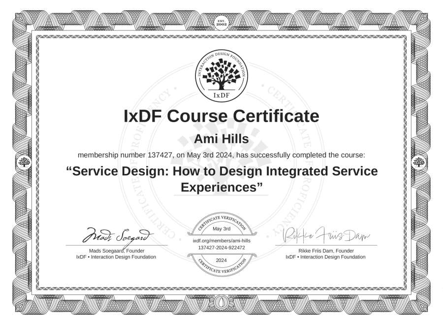 Ami Hills's IxDF Course Certificate: Service Design: How to Design Integrated Service Experiences