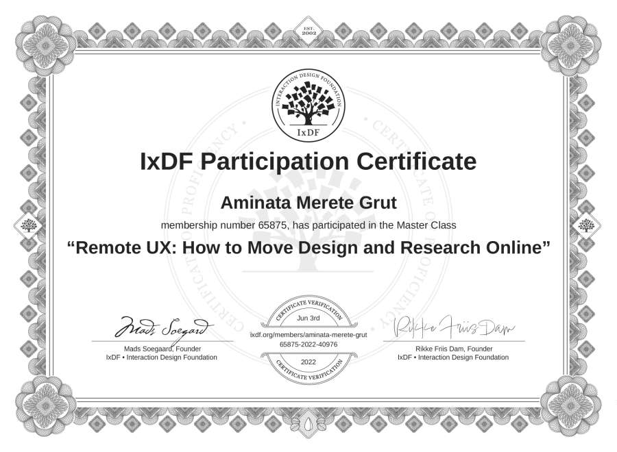 Aminata Merete Grut's IxDF Masterclass Certificate: Remote UX: How to Move Design and Research Online
