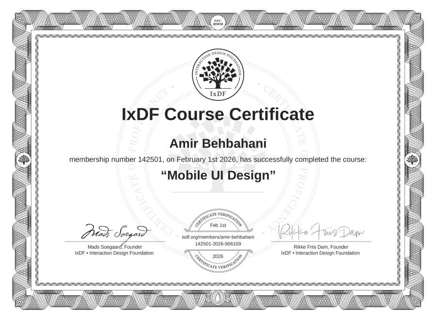 Amir Behbahani's IxDF Course Certificate: Mobile UI Design