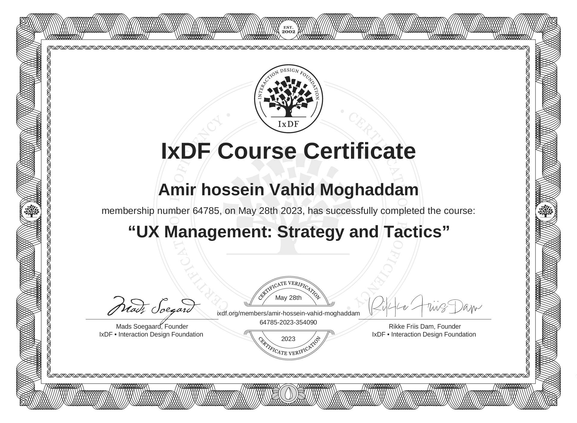 The IxDF Course Certificate above is awarded to Amir hossein Vahid Moghaddam in formal recognition of their coursework surpassing the rigorous benchmarks of exceptional performance established by the IxDF Educational Codex.