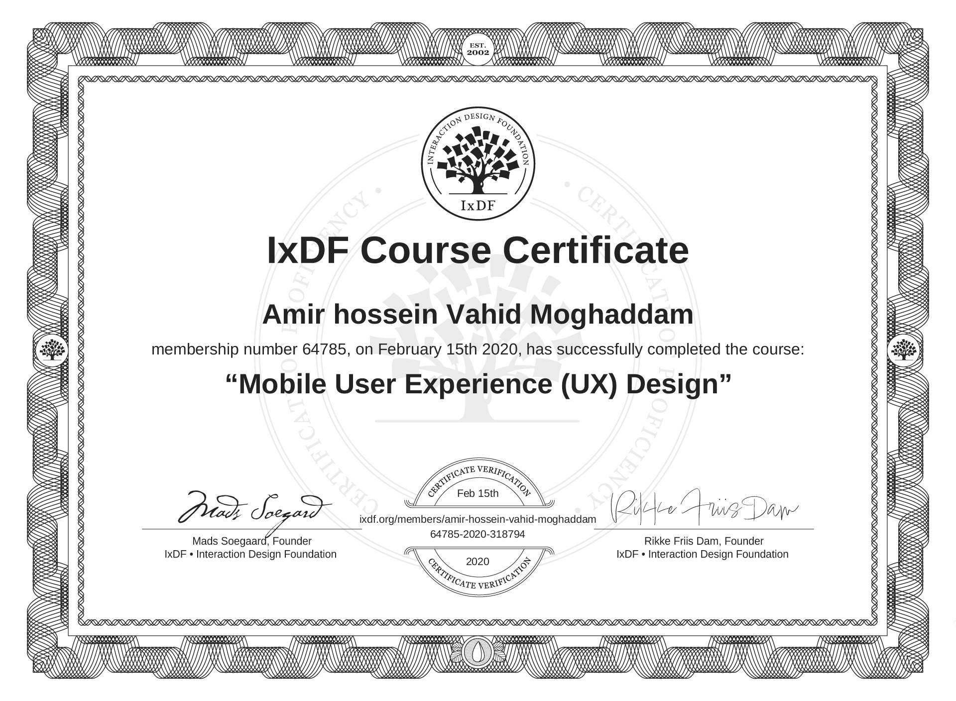 The IxDF Course Certificate above is awarded to Amir hossein Vahid Moghaddam in formal recognition of their coursework surpassing the rigorous benchmarks of exceptional performance established by the IxDF Educational Codex.