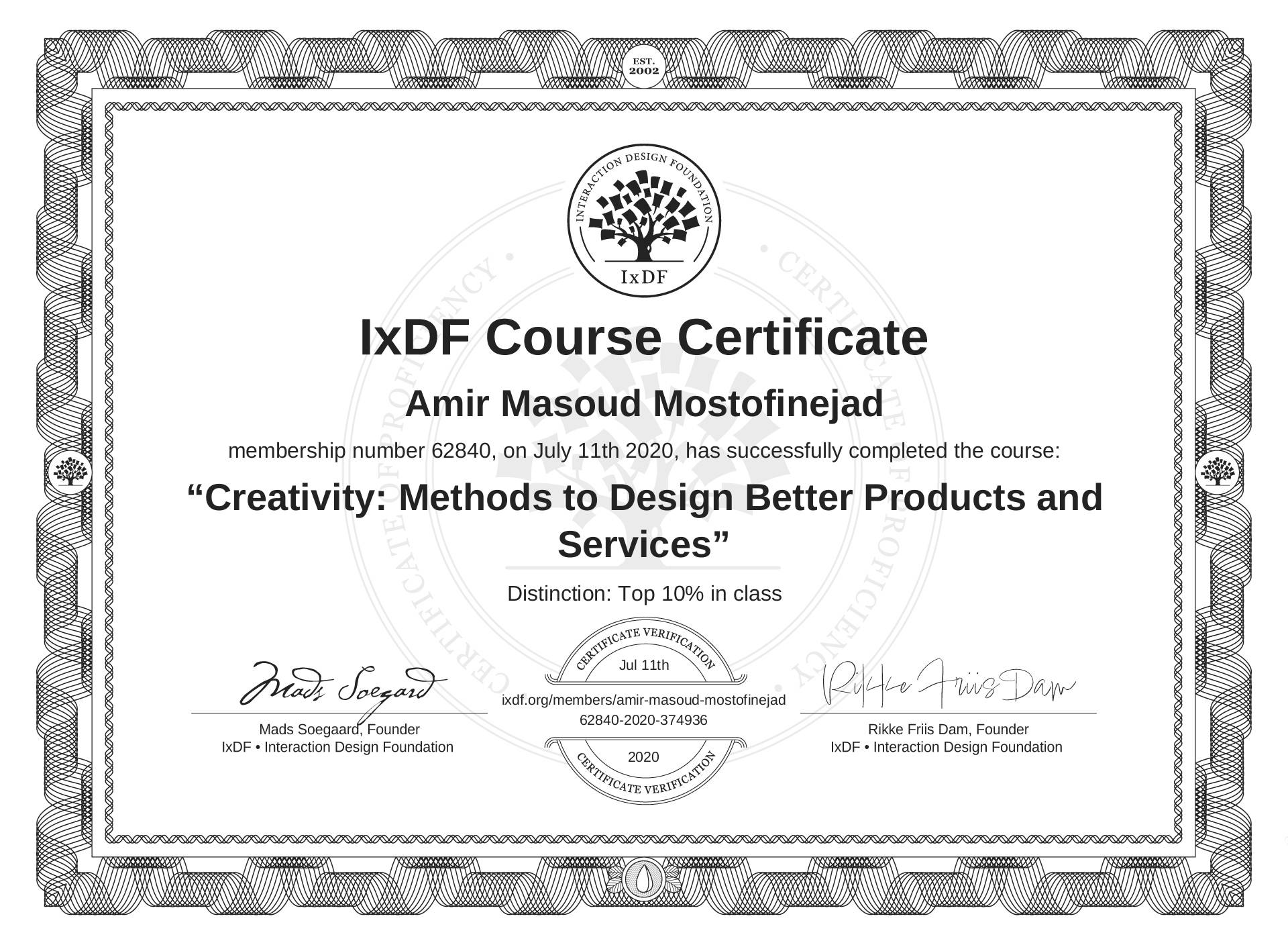 The IxDF Course Certificate above is awarded to Amir Masoud Mostofinejad with a Top 10% Distinction in formal recognition of their coursework surpassing the rigorous benchmarks of exceptional performance established by the IxDF Educational Codex.