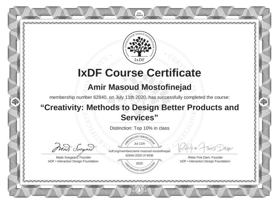 Amir Masoud Mostofinejad's IxDF Course Certificate: Creativity: Methods to Design Better Products and Services