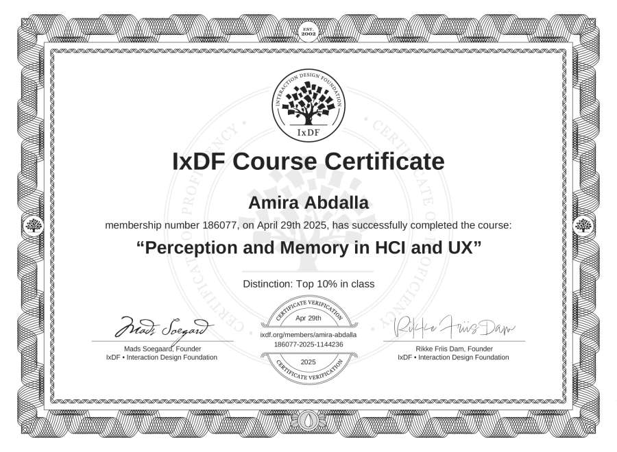 Amira Abdalla's IxDF Course Certificate: Perception and Memory in HCI and UX