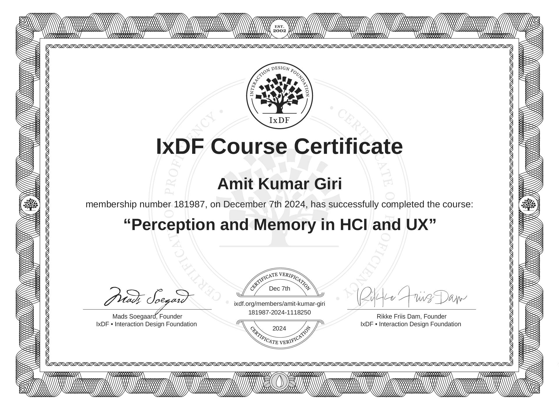 Amit Kumar Giri's IxDF Course Certificate: Perception and Memory in HCI and UX