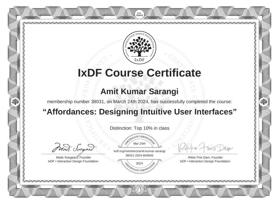 Amit Kumar Sarangi's IxDF Course Certificate: Affordances: Designing Intuitive User Interfaces
