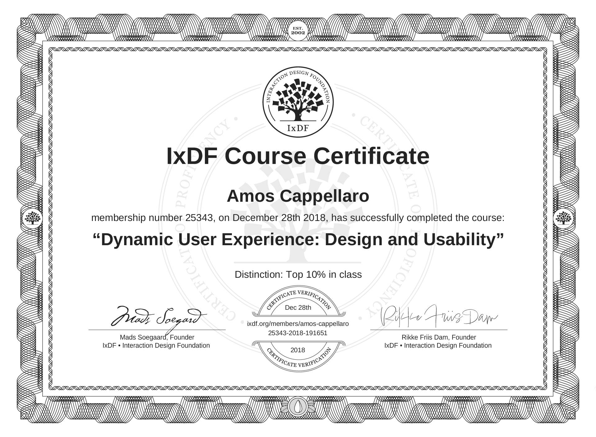 The IxDF Course Certificate above is awarded to Amos Cappellaro with a Top 10% Distinction in formal recognition of their coursework surpassing the rigorous benchmarks of exceptional performance established by the IxDF Educational Codex.