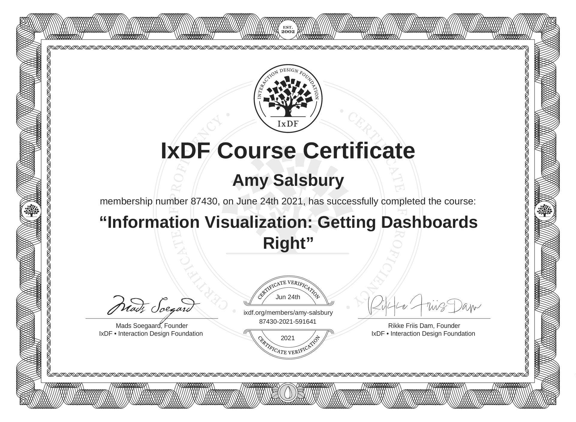 Amy Salsbury's IxDF Course Certificate: Information Visualization: Getting Dashboards Right