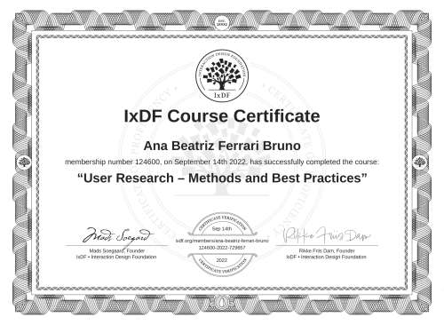 IxDF Course Certificates are awarded to Ana Beatriz Ferrari Bruno in formal recognition of their coursework surpassing the rigorous benchmarks of exceptional performance established by the IxDF Educational Codex.