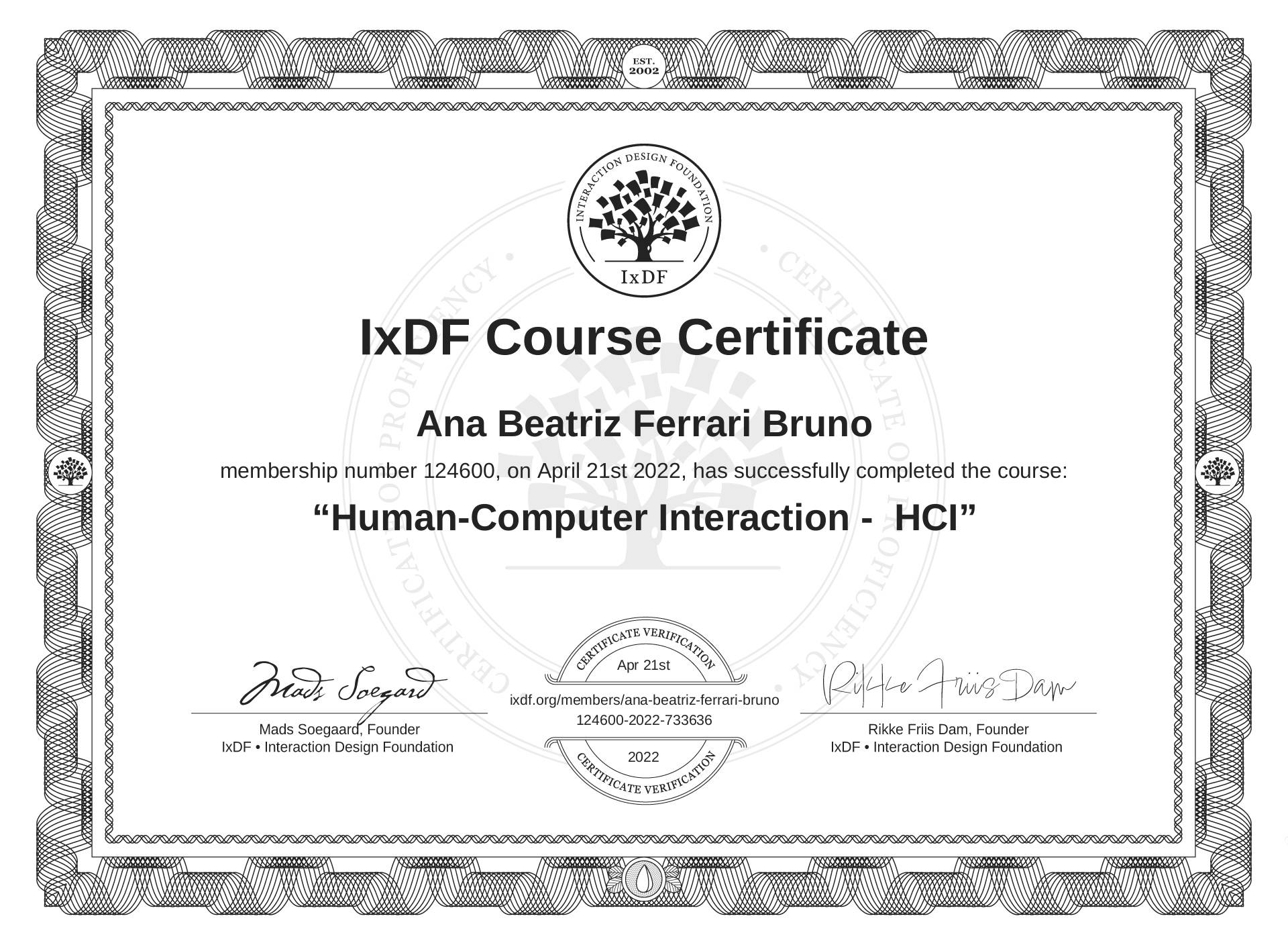 Ana Beatriz Ferrari Bruno's IxDF Course Certificate: Human-Computer Interaction - HCI