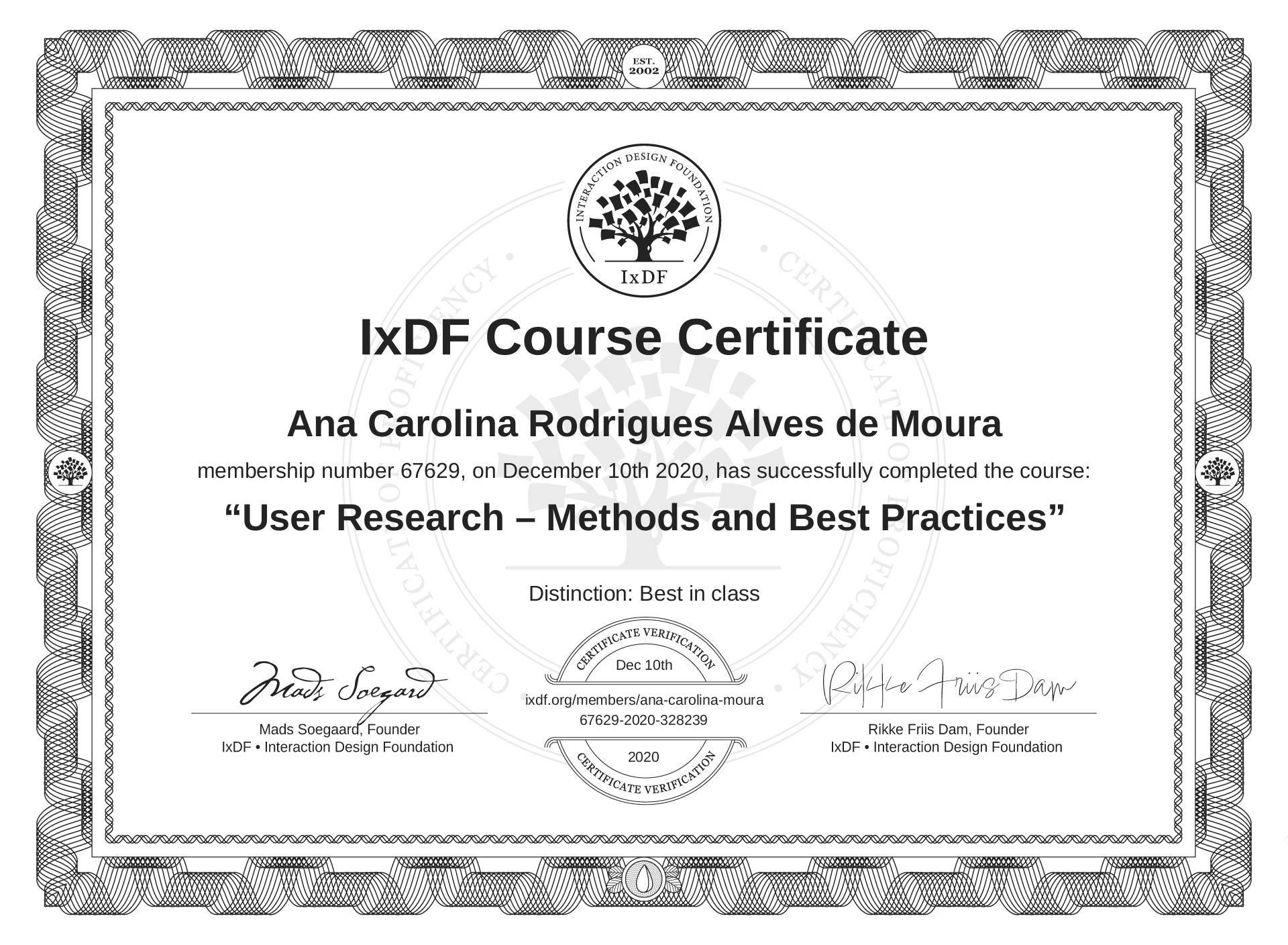 The IxDF Course Certificate above is awarded to Ana Carolina Rodrigues Alves de Moura with a Best in Class Distinction in formal recognition of their coursework surpassing the rigorous benchmarks of exceptional performance established by the IxDF Educational Codex.