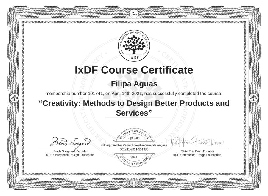 Filipa Águas's IxDF Course Certificate: Creativity: Methods to Design Better Products and Services