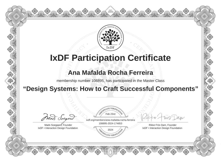 Ana Mafalda Rocha Ferreira's IxDF Masterclass Certificate: Design Systems: How to Craft Successful Components