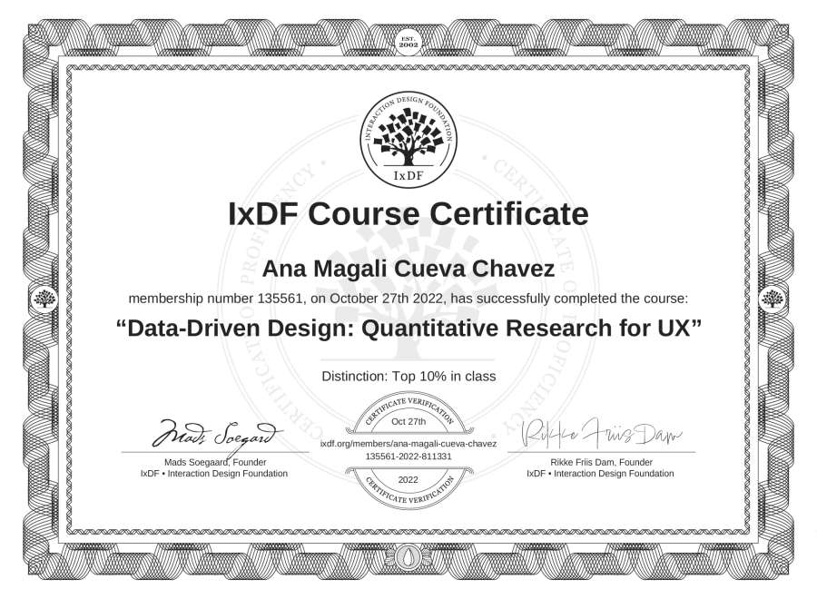 Ana Magali Cueva Chávez's IxDF Course Certificate: Data-Driven Design: Quantitative Research for UX