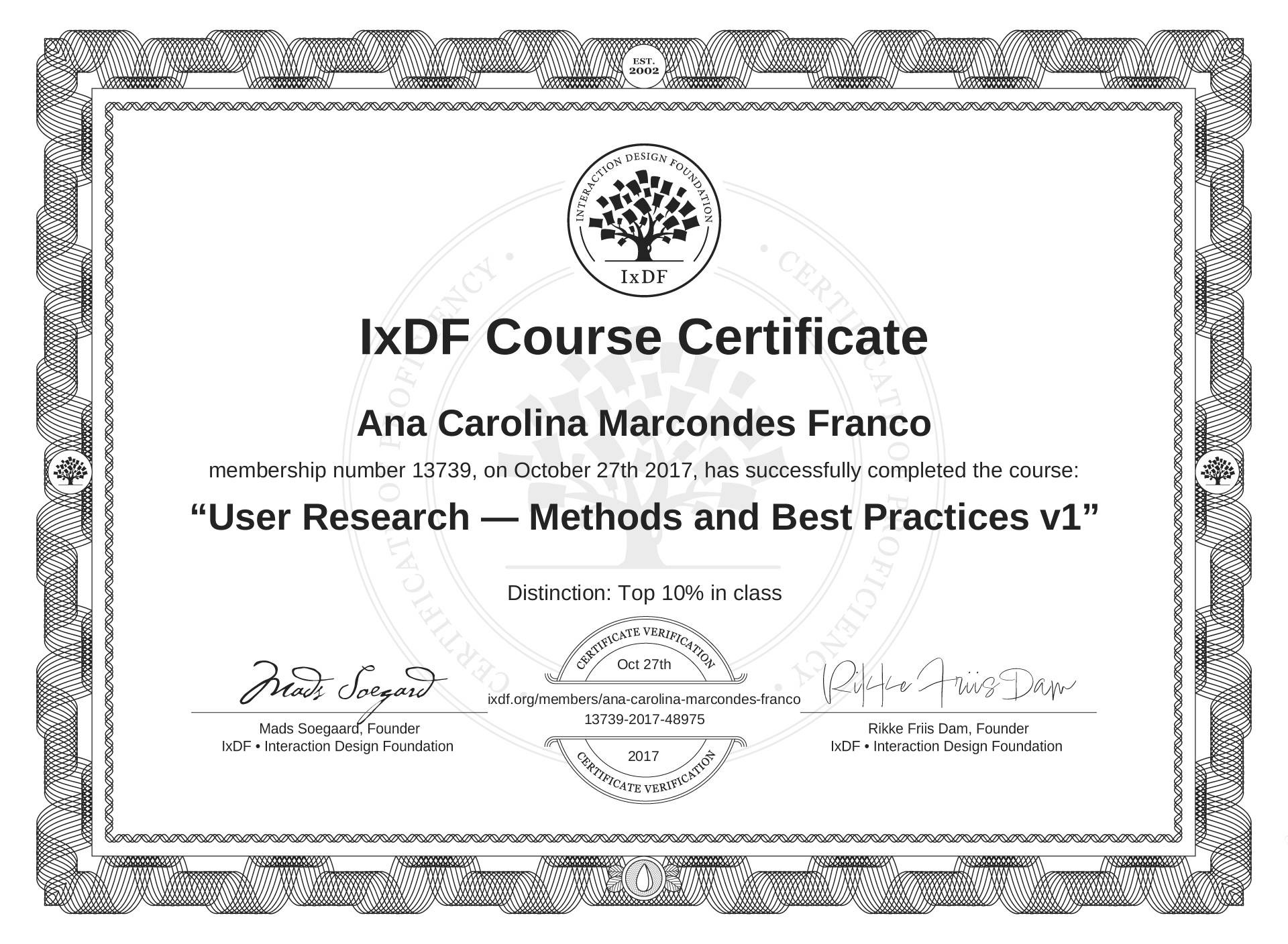 The IxDF Course Certificate above is awarded to Ana Carolina Marcondes Franco with a Top 10% Distinction in formal recognition of their coursework surpassing the rigorous benchmarks of exceptional performance established by the IxDF Educational Codex.