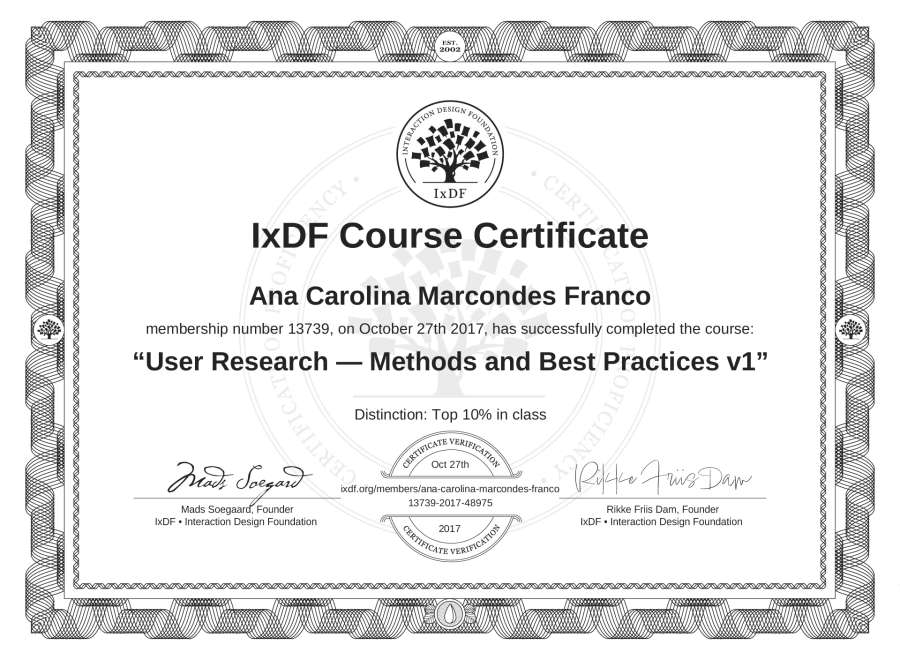 Ana Carolina Marcondes Franco's IxDF Course Certificate: User Research — Methods and Best Practices v1